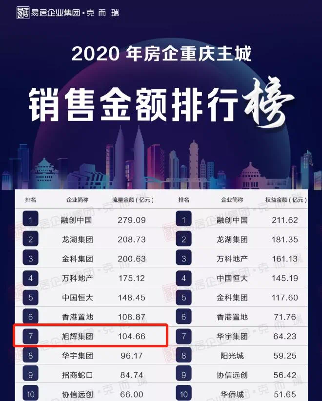 主城范围内,「西南旭辉」排名第7位,这是品牌连续四年进入重庆房企销售榜TOP10之列;