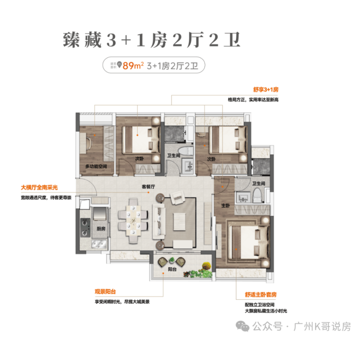 建面约85㎡ 4房2厅2卫,双次卧带飘窗,使用率达至新高