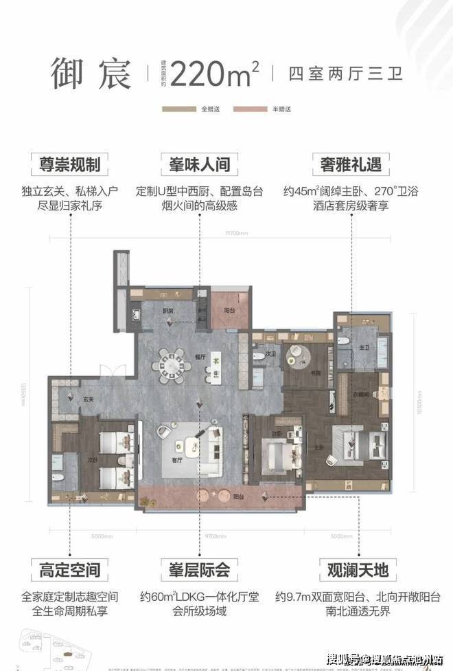 220㎡户型亮点:独立玄关,私享电梯厅,极具私密性和独立性;定制U型中西厨、配置岛台,烟火间的高级感;约60㎡LDKG一体化厅堂,会所级场域;约9.7m双面宽阳台、北向开敞阳台,南北透通无界;约45m阔绰主卧、270°卫浴,酒店套房级奢享。