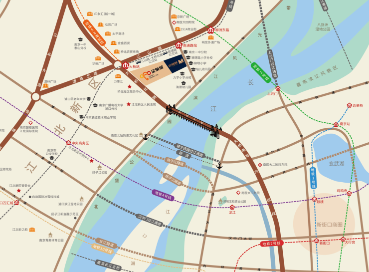 【区位】项目位于大桥第一站,是桥北人流车流最繁华的地段,无缝衔接江南江北