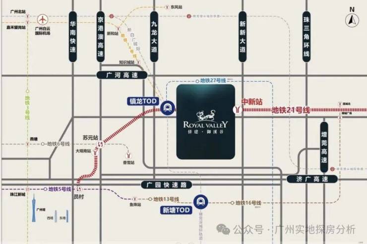 交通配套:地铁21号线中新站上盖,步行即可到达地铁站,快线3站直达天河区;同时临近穗莞深城轨、新白广城轨,可通过轨道交通快速连接白云机场、深圳机场;周边高速路网发达,广河高速、花莞高速、增天高速(建设中)等可快速通达广州核心区域及珠三角城市。