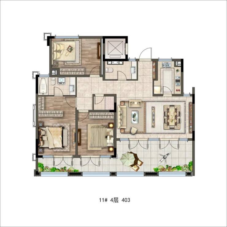 除了下叠户型,位于最高层4层的平墅产品,建筑面积约128㎡,四房两厅三卫,将空中花园的概念引入平墅。