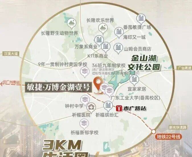 轨道交通:地铁 22 号线,市广路站距项目约 900 米,步行 10分钟可达,通过该线路可实现 “1 站番禺广场、2 站万博中心、3 站琶洲 CBD、4 站珠江新城” 的通勤效率;