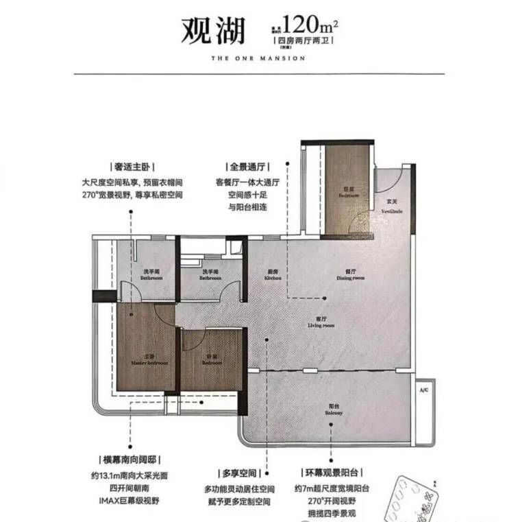 建面132平四房两卫,横厅南北对流设计,超50平的大方厅,约5.8米的景观阳台,主卧面积也有30平,带独立衣帽间。