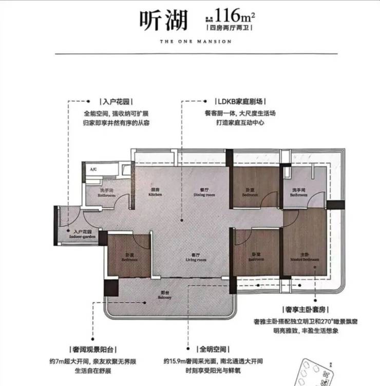 建面116平四房两卫,带独立入户花园,横厅南北对流设计,约7米的长阳台,三间房都是南向,主卧同样是环幕飘窗。