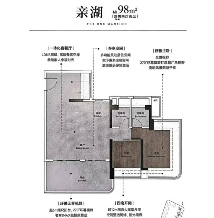 建面98平3+1房两卫,LDKB一体化设计,超6米的景观阳台,四开间朝南,主卧带270度环幕飘窗。