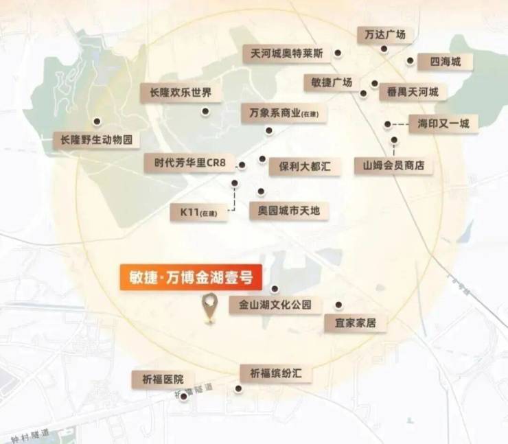 项目南侧900多米处就是约43万㎡的祈福缤纷世界、超2万㎡宜家家居。周边3公里繁华商圈,包括万达广场、天河城、华润万象系建设中、K11(待开业)、四海城。