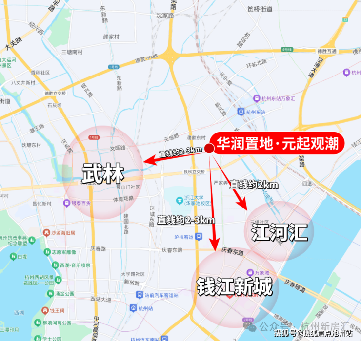 杭州华润置地·元起观潮择址城市精粹之上——上城区安琪儿板块,毗邻杭州第一中心武林和第二中心钱新,北近京杭运河,土地价值高,环境优美,交通便利,是杭州新城核心组成部分。项目所在大区域为城市核心区,周边路网发达,城市界面较好,场地周边已规划幼儿园及小学,配套齐全,地块北侧200M为京杭运河,为场地赋能。