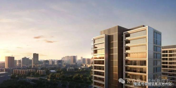 历久弥新的经典形制丨高层:底层以沉香米黄石材多重叠加,主体大面三玻两腔玻璃幕墙+仿石铝板斜切面搭配古铜色铝板内侧镶边打造大尺度油画框般经典华丽的立面,北侧搭配深灰色格栅强化立面对比效果;▲元起观潮效果图