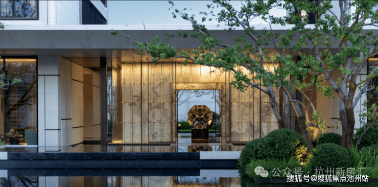 建筑立面上,源自罗伯特・斯特恩古典风格的现代转译,融入蒙迪里安格构手法,以质感石材、鎏金铝板与大面积玻璃的精妙组合,搭配独墅感框景序列,既彰显古典的厚重与尊崇,又兼具现代的简约与通透,成为城市天际线中一道独特的风景。