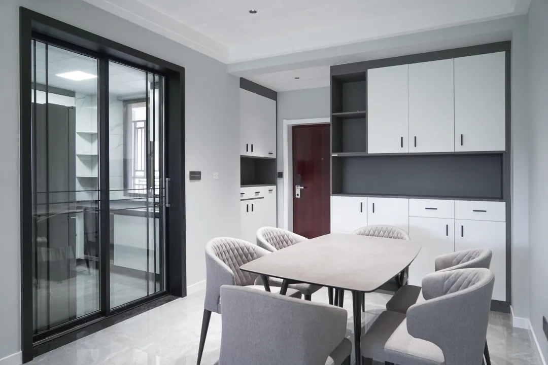 亿合门窗极景推拉门,安装在厨房具备了超高的颜值,外观设计美观大方,与室内极简的风格相得益彰。卫生间选取极景平开门,简而不凡的配色,搭配灵动的线条,特别符合现代极简的风格。