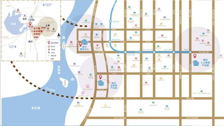 周边多个住宅小区云集,有苏州大学未来校区、苏州湾外国语学校等优质教育资源;邻近苏州第九人民医院,距苏州湾体育中心仅100米;西边濒临太湖,坐拥优质环境同时享有各类休闲文娱资源。