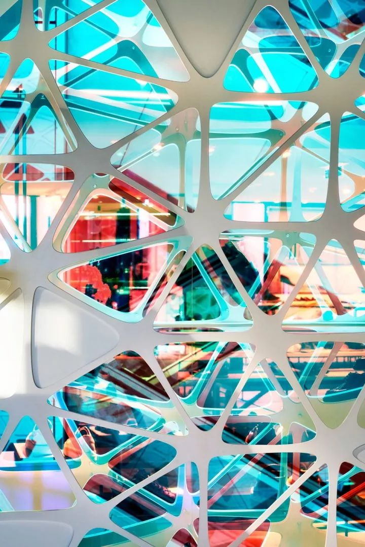 世界知名百货商场——巴黎春天新改造的中庭空间,为致敬商场1894年的标志性彩色玻璃圆顶,将一个纵向的圆顶(也称为面纱)引入建筑的核心。由白色铝制面板组成的面纱高达25.5米,重达24吨。表面运用巧妙手法设计了约17200个覆盖一层双色玻璃的花瓣状穿孔,这些“彩色花瓣”会随着人们的视角变化而发出彩虹色的光芒。整个中庭空间在面纱的烘托下,如同漂浮在玻璃地板和镜面屋顶之间。