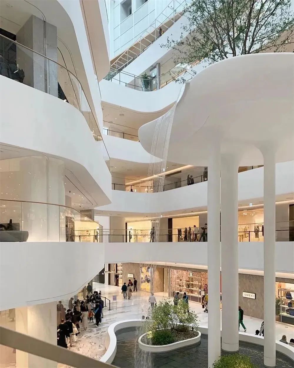 韩国现代首尔百货作为集商业、购物、休闲于一体的零售地标,以其前卫时尚和视觉刺激的现代设计元素为顾客提供难忘而轻松的购物体验。中庭设计利用柔和的元素,营造禅意的氛围。12米雕塑瀑布置于主中庭,周围环绕着有机形状的浮岛,与周边白色的建筑主色调打造出喧嚣下的静谧空间。沿着天花内边缘的反光板仿照水波纹,创造出仰望倒影池塘的视觉效果。