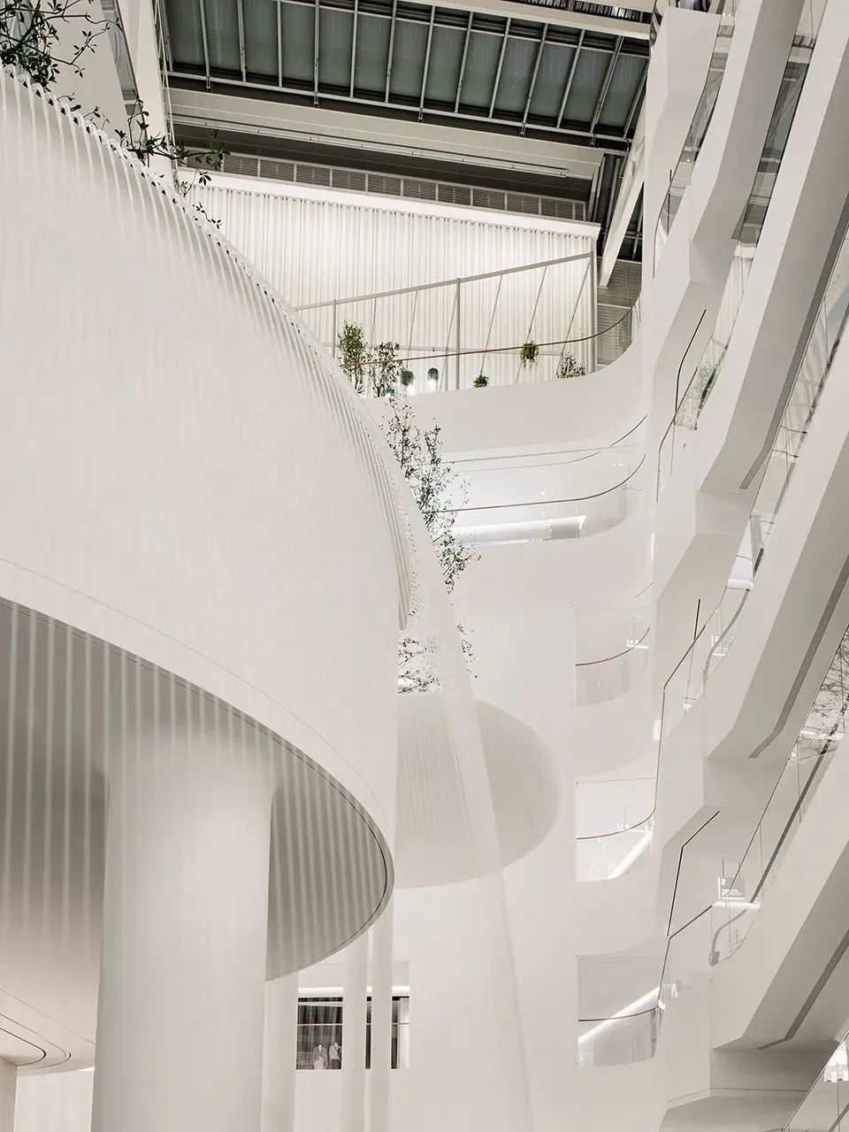 在O中庭设计了一个“O”形态的旋转楼梯,整体色调以白色为主,搭配镂空钢丝网的扶手和条形灯饰照明,打造具备时尚美感的空间氛围。