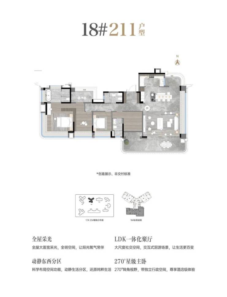 超薄平外立面,以大量玻璃幕墙、航空铝板设计,打造更具国际化的建筑形态。错落有致的新派建筑群,与CBD建筑群形成起伏天际线,家就是城市封面的一部分。
