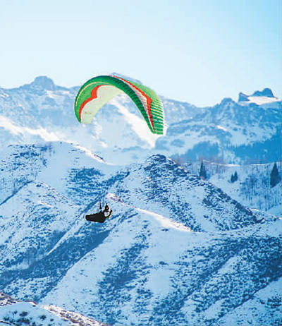 在新疆维吾尔自治区阜康市天山天池国际滑雪场,游客乘滑翔伞在高空翱翔。何 龙摄(人民图片)
