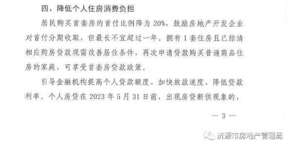 6月29日,济源市房地产管理局官方微信披露,济源市人民政府办公厅近日发布《济源市促进房地产平稳健康发展若干措施》。其中指出,降低个人住房消费负担。居民购买首套房的首付比例降为20%,鼓励房地产开发企业对首付分期收取,但最长不宜超过一年。个人房贷在2023年5月31日前,出现房贷断供现象的,可以延期还本付息,最长可延期一年,银行暂不申请法院对断供房屋采取拍卖、变卖等处置措施;银行已申请执行的,法院征得银行同意后,暂不采取拍卖、变卖的处置措施;房贷断供行为不纳入个人征信范围。