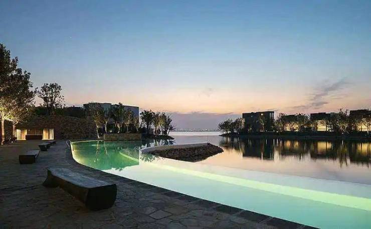 音昱水中天坐落在阳澄湖畔,整个区域就像一座长长的岛,超过一公里的距离,两侧都是湖面,可谓“宛在水中央”,它离城市很近,却又好像很远,明明20分钟之外的世界是喧闹与嘈杂,这里却一派空灵姿态。其实,距离苏州最繁华的园区就20分钟车程,离上海也不过一小时。