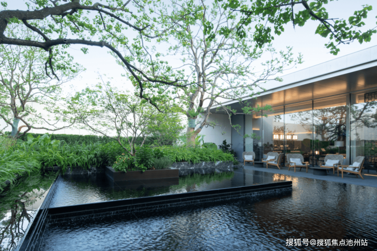 层次丰富的水台,叠影出多娆的树影,或飘逸,或优雅的姿态,透过建筑落地窗形成斑驳舒雅的空间谧境。在水苑中拾得一片宁静,回应当代都市人对生活的追求与渴望,将闲适时光拉长,达到生活的平衡与内心的宁静,重新与本真的自我建立链接。