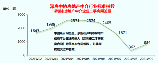 (注:网签量,系指在深圳市房地产信息系统在线签订《深圳市二手房买卖合同》示范文本合同份数,并非最终成交过户套数,但网签数据相比最终完成成交过户的数据更能体现市场运行态势。本文所提网签量都参照此释义。)(数据来源:深房中协中介标准指数)