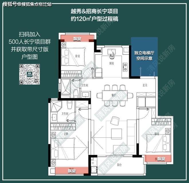 小区一共两个户型:120㎡三房两卫、143㎡四房两卫。