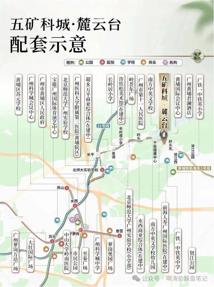 项目距三甲医院市第十一人民医院(黄埔院区)约500米,距综合医院前海人寿广州国际医院约440米。距广州市干部和人才健康管理中心约996米,距大湾区首个LEED金级认证、医养结合的高端养老社区——泰康之家·粤园,约835米。