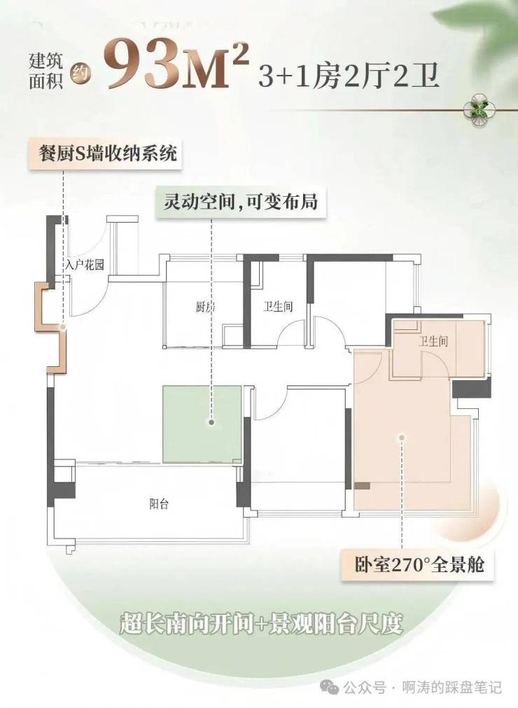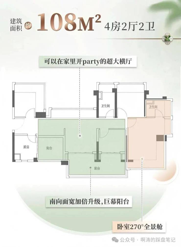 108平户型,拥有加倍升级面宽的巨幕阳台,超大横厅在家就能开party!