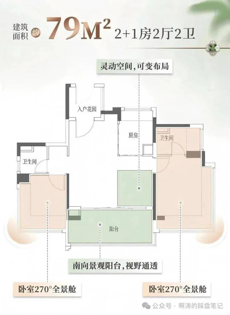 79平户型三开间朝南的设计,双卧室均配备L型飘窗;让阳光能毫无遮挡地洒进每个房间;超大宽厅,既可以作为家庭聚会的大客厅,也能通过灵活隔断改造成第三间独立卧室;