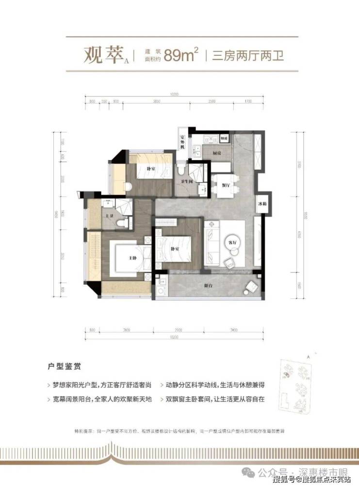 89㎡的3房2厅2卫,1栋02.03户型,设计的是经典竖厅格局,客厅3.4米开间,LDKB一体化,S墙设计预留冰箱卡槽位,动静分区,分别做到了主卧16.28㎡/次卧9.53㎡/次卧9.42㎡(包含墙体飘窗),U型厨房,卫生间干湿分离,得房率约79.1%(不含赠送),客厅连接次卧出9.45m²观景大阳台,西南朝向。套内面积70.43m²+赠送面积14.58m²=实用面积85.01m²,加上赠送面积后得房率96.1%。