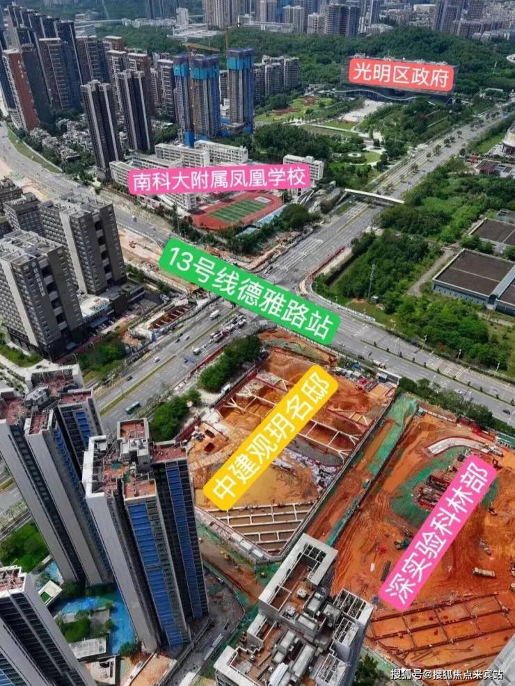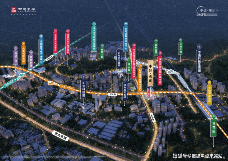 中建观玥名邸,位于光明区凤凰街道光侨路与观光路交汇处东南侧,地处光明科学城核心区与凤凰城板块交汇处,是光明高铁站板块最后一块住宅用地。作为光明科学城"一心两区"战略布局中的关键节点,项目紧邻区政府、文化艺术中心等行政文化配套,2公里范围内覆盖蓝鲸世界、万达广场等成熟商圈,坐享"15分钟社区生活圈"便利。依托光明科学城建设世界级原始创新高地的规划,项目所在区域将受益于大量高端科学人才涌入带来的区域价值提升,同时享有"北林、中城、南谷"差异化城市风貌中的"乐活城"特质,兼具科技感与宜居性。