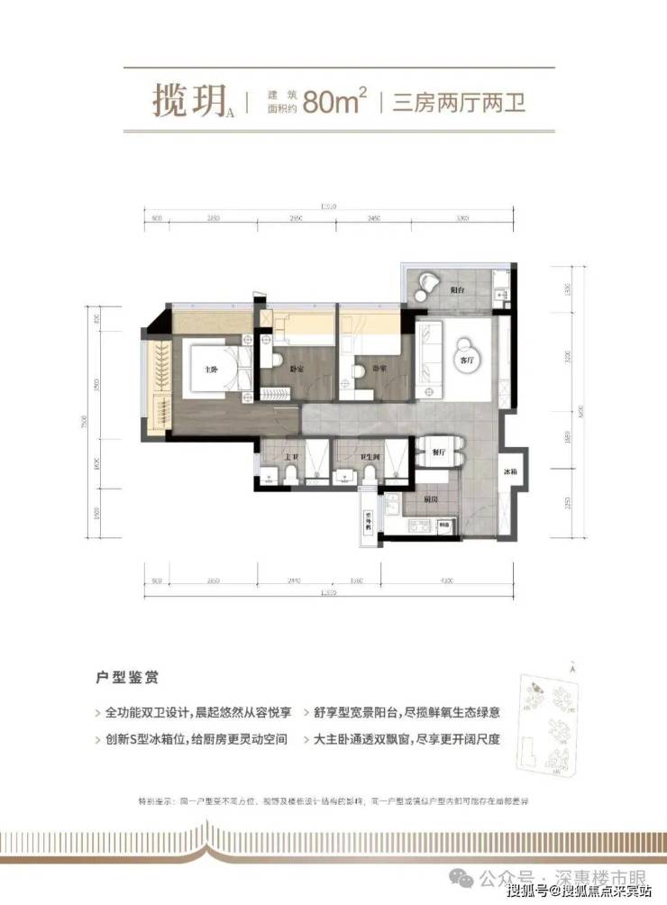 80㎡的3房2厅2卫,设计的是竖厅格局,客厅3.3米开间,LDKB一体化,S墙设计预留冰箱卡槽位,动静分区,分别做到了主卧16.38㎡/次卧8.16㎡/次卧7.84㎡(包含墙体飘窗),U型厨房,卫生间干湿分离,得房率约79.1%(不含赠送),阳台4.95m²东北朝向。套内面积63.98m²+赠送面积11.55m²=实用面积75.53m²,加上赠送面积后得房率94%。