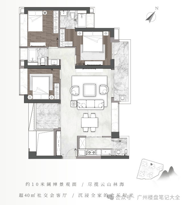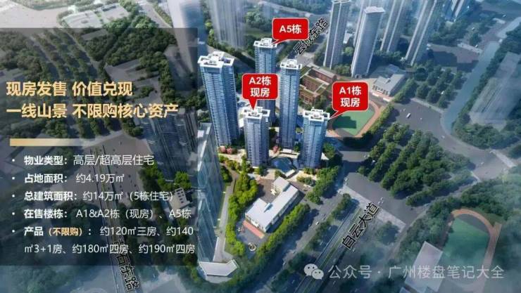 卖点一、云山头排,臻藏豪宅:落位云山西麓, 直面主峰摩星岭, 0 距离山景, 片区内真正唯一云山头排豪宅。 坐享“市肺”疗养级生态环境, 广州不可复制稀缺资源。千年帝王风水龙脉,一城权贵聚居之地。