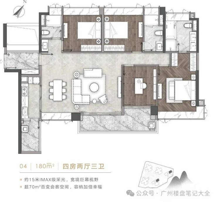 卖点六、豪宅之选, 标杆之作: 富力住宅体系顶峰标杆之作, 搭载集团最高产品打造标准。内外皆景, 一线山景&中央园林, 灵动百变超大客厅。