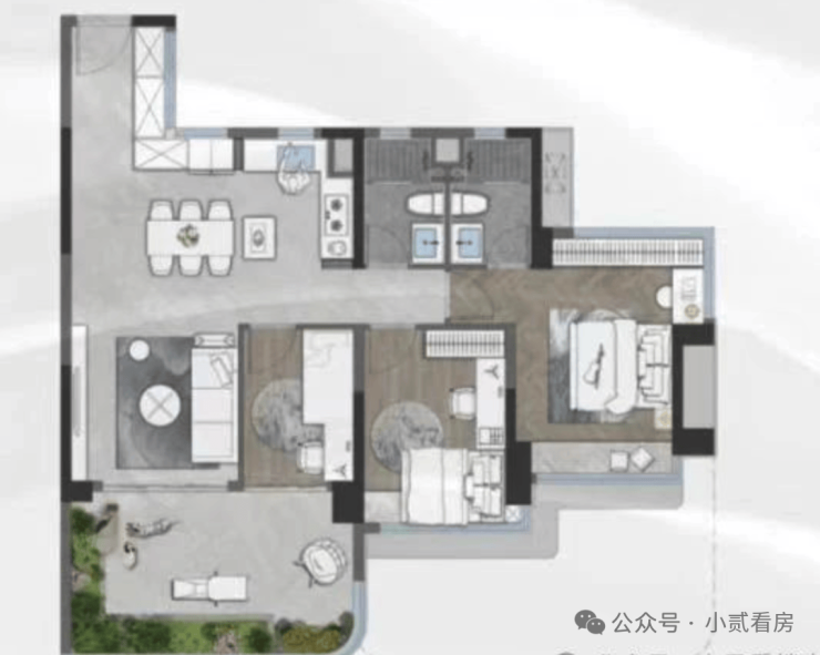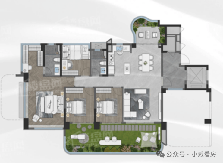 该户型把赠送面积都给了工区和主卧,全屋做到4+1房,空中花园连通公区,面积达到73㎡。最牛的是,主卧还带约14㎡的空中花园,打造一个私享庭院。