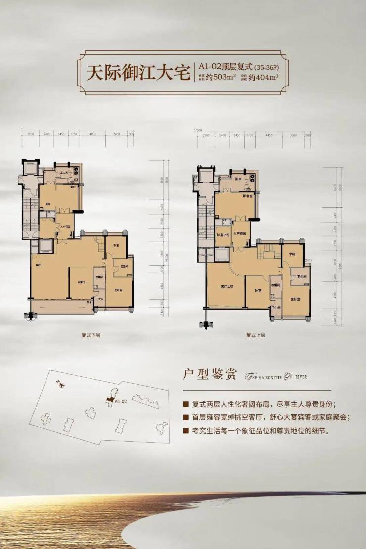 天墅产品:约28层-35层高,户型面积约360-950㎡的奢华四到五房户型;每户均特设私家入户花园,超大开间,超大阳台,无敌景观;