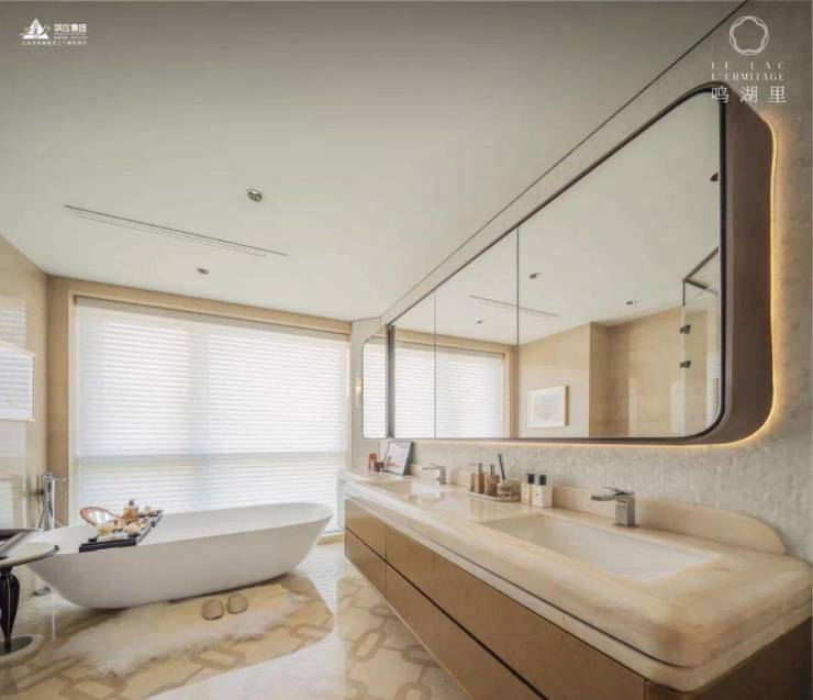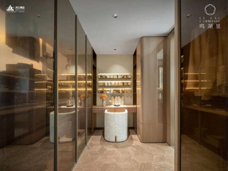 起居间的大体量衣柜免去后期定制,卫生间地面、墙面大理石通铺,汉斯格雅、唯宝等国际一线卫浴品牌集结,连美妆冰箱都配备。