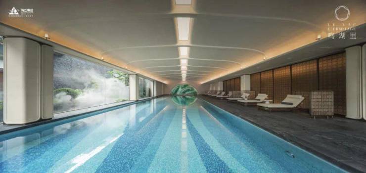 室内泳池与庭院水幕形成互动,吊顶以船龙骨为造型,泳池背景参照“湘湖月夜”,透明亚克力织起的层叠波浪,全由人工现场拼装。