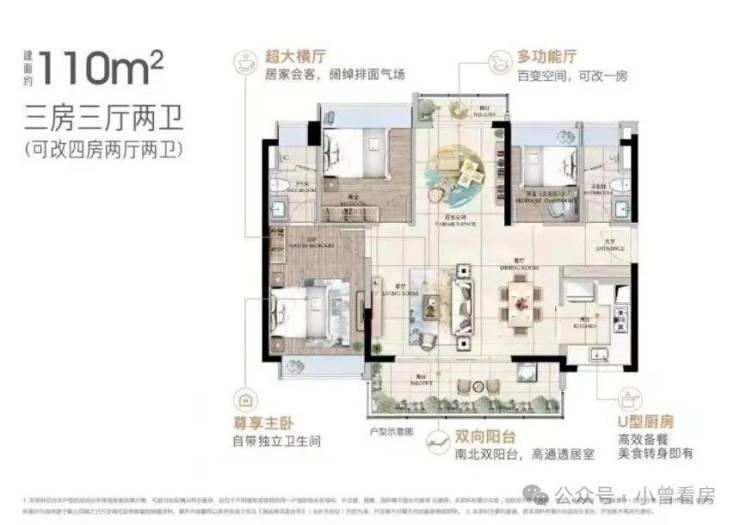 110㎡四房两厅两卫剩余少量现房房源,主要在 1-2 栋的 3-4 楼及高楼层,毛坯房 260 万起,带装修房 320 万起,LDK 一体化设计,客餐厨阳台连通,南向面宽达 10.2 米,次卧面积均在 9㎡以上,适合三口之家。