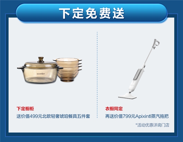 解锁臻选季攻略,法国司米橱柜不负每一份热爱,活动期间不止钜惠折扣,更有好礼相送。凡是在相应门店直接下定活动橱柜,即可送价值499元北欧轻奢琥珀餐具五件套;若是衣橱同时下定,在此基础上再送价值799元Apixintl蒸汽拖把,省下另行购置厨柜定制必需品的花销。