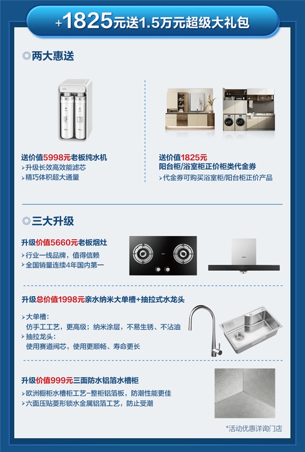 不同的橱柜单品,让厨房赋予了不一样的生命。活动期间购买任一橱柜产品,加购1825元即可获得1.5万元超级大礼包。法国司米橱柜两大惠送,5998元老板纯水机、阳台柜/浴室柜正价柜类代金券;三大升级福利,升级价值5660元老板烟灶、升级总价值1998元亲水纳米大单槽+抽拉式水龙头、升级价值999元三面防水铝箔水槽柜,只为给您更优质的服务体验。于热爱生活的人而言,唯有美食不可辜负。想要做出美味佳肴,更要体会生活乐趣。