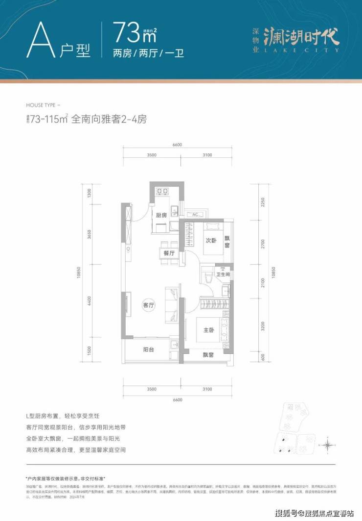 73㎡的2房2厅1卫,设计的是竖厅格局,客厅3.5米开间,LDKB一体化设计,2个卧室分别做到了3.1米/2.7米的宽度,L型厨房,卫生间干湿分离,得房率77-78%(不含赠送),阳台都是西南朝向。