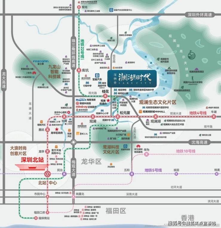●片区现有富士康、华润三九、长安标致雪铁龙等龙头企业入驻,华为将拟建76万㎡新能源大厂,迈瑞亦布局建设医疗器械标杆制造基地,观澜成为大湾区产业高地,高净值尖端人才涌入,就近置业需求井喷。