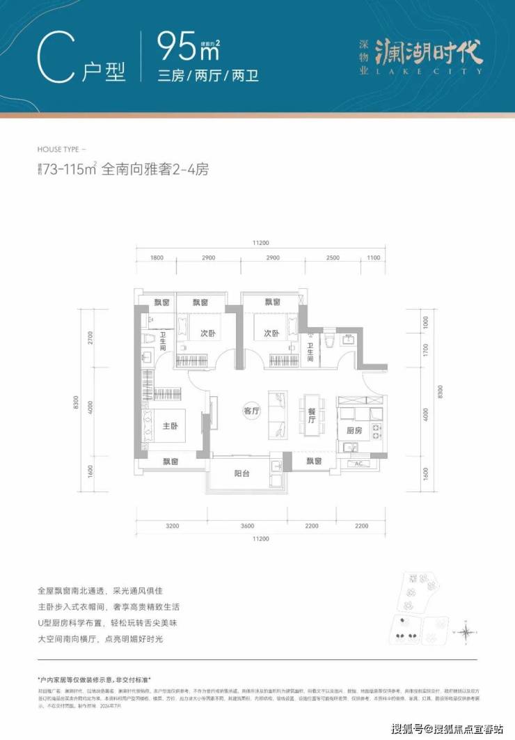 95㎡的3房2厅2卫,设计的是横厅南北通透格局,客餐厅一体化5.8米开间,3个卧室分别做到了3.2米/2.9米/2.9米的宽度,主卧套间设计,U型厨房,卫生间干湿分离,得房率77-78%(不含赠送),阳台主朝西南或东南向。