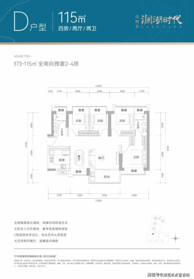 115㎡的4房2厅2卫,设计的是横厅南北通透格局,仅1单元01户型才有,客餐厅一体化6.1米开间,4个卧室分别做到了3.5米/3米/2.8米/2.5米的宽度,主卧套间设计,U型厨房,公卫三段式分离,得房率77-78%(不含赠送),阳台主朝东南向。