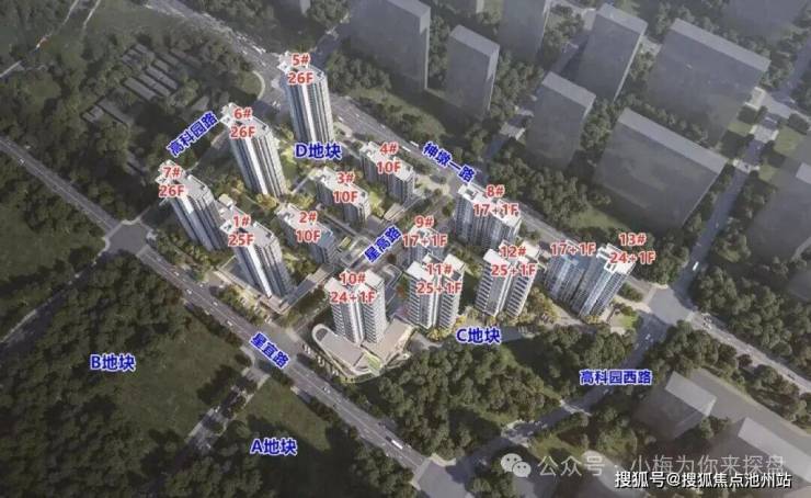 该项目住宅部分共计由13栋10-26层的洋房和小高层产品组合,分为C、D两个地块,总户数843户,总容积率2.1。其中C地块容积率2.27,共计6栋楼,共计323户;D地块容积率1.98,共计7栋楼,共计520户。都属于当下容积率较低的地块。南向立面为公建化外立面,大面积转角玻璃幕墙,颜值在线。车位配比1:1.25,共计1052个车位。