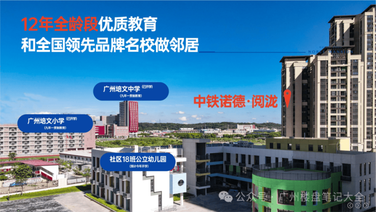 【教育配套】楼下广州培文中学、广州培文小学已开学,全寄宿制,北大教育资源,师资力量95%教师硕士毕业,国际化标准双语教学;自建18班社区公立华师品牌幼儿园已开学。