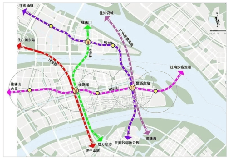 项目距离地铁18号线横沥站约400米不到,横沥岛规划地铁 18 号线、广中珠澳高铁、地铁 NS2 线、地铁 15 号线、 地铁 NS1 线。其中,横沥站为 18 号线、15 号线、NS2 线三线换乘中心,横沥东站为 广中珠澳高铁、NS1 线、NS2 线三线换乘中心。
