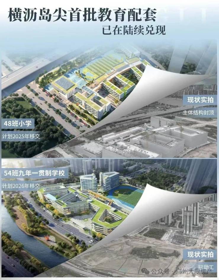 横沥岛上规划小学3所、九年制学校3所、十二年制学校1所,国际学校1所;其中,1所54班九年制学校(2026年投用)及1所48班小学(2025年投用)已获批建设。