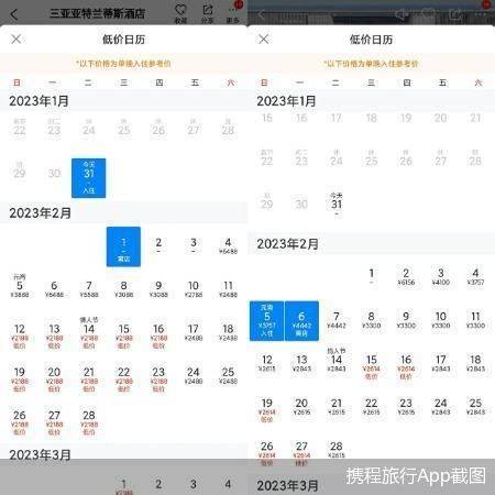 北京商报记者从携程旅行App上看到,三亚亚特兰蒂斯酒店2月5日(正月十五)海景大床房的房价为3088元/晚,而1月21日除夕当晚,同房型的房价为5688元/晚;2月12日的同房型房价为2188元/晚,与除夕的房价相比,降幅超60%。同样,三亚珊瑚湾文华东方酒店1月21日翠园轩高级园景大床房的价格为6231元/晚,2月5日同房型房价为3827元/晚,降幅近40%;2月12日的房价为2195元/晚,降幅超60%。这就意味着,正月十五后部分酒店价格开始回落,陆续回归到平日房价。